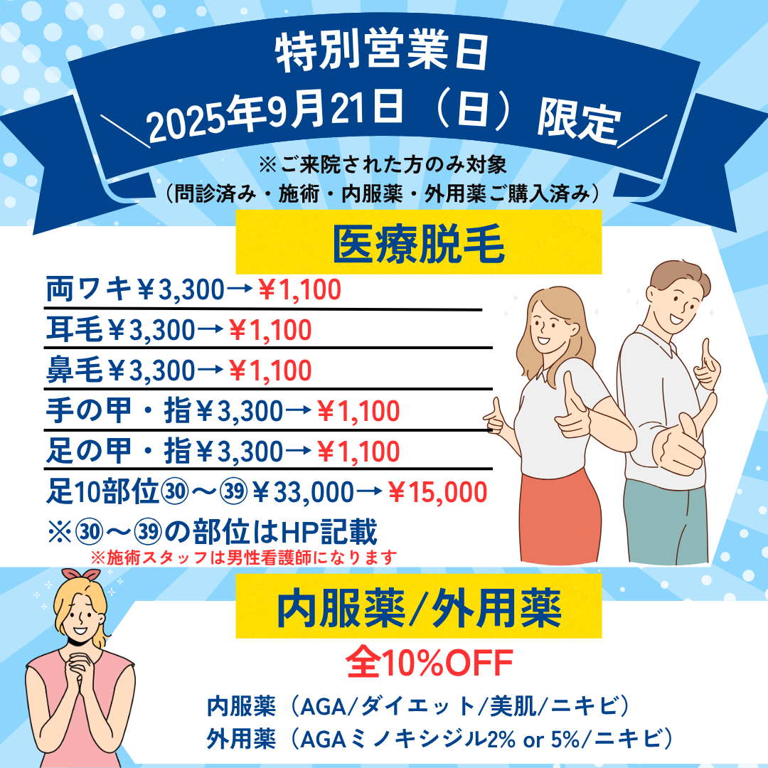 また、既に問診済み、施術済み、内服および外用薬をご購入の方限定でのキャンペーンも実施しております
